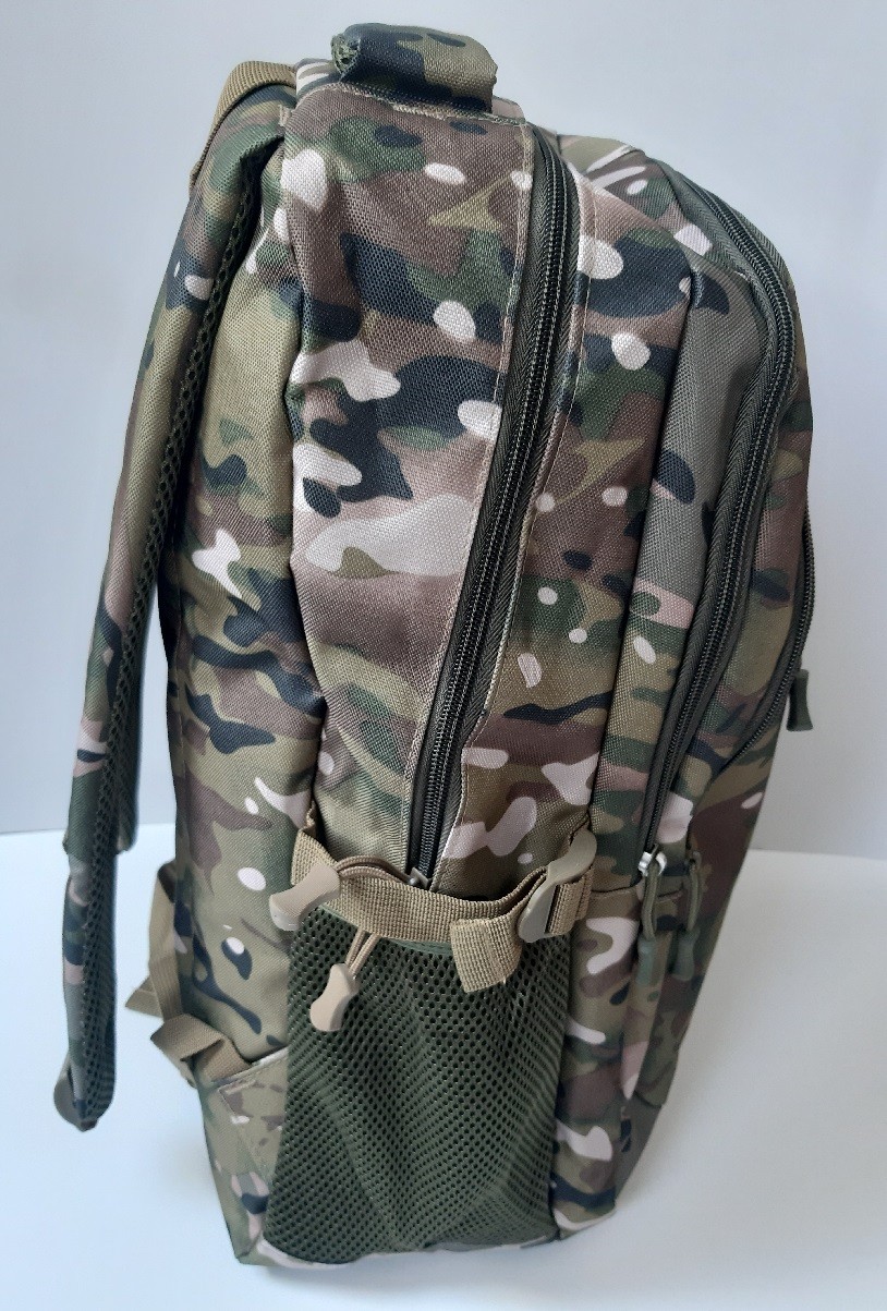 Maskáčový turistický ruksak s obsahom 25L. Má dve veľké komory so zipsovým zapínaním vnútri na chrbtovej časti je otvorená priehradka. Dve predné vrecká so zipsovým zapínaním a bočné vrecká na fľašku zo sieťového materiálu. Nastaviteľné polstrované popruhy s plastovými sponami.