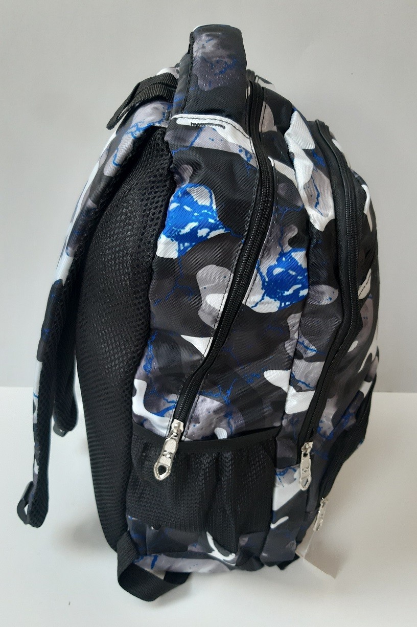Maskáčový modrý ruksak SPORT s obsahom 20L. Má dvojkomorové vnútro so zapínaním na zips dve predné vrecká na zips a bočné vrecká zo sieťového materiálu na fľašku. Popruhy sú polstrované, nastaviteľné s plastovou sponou.