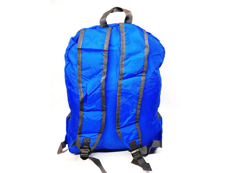 Športový skladací ruksak modrý zo 100% PES. Predné vrecko slúži na zloženie ruksaku na formát 20x15 cm. V zloženom stave sa dá uchytiť na opasok.