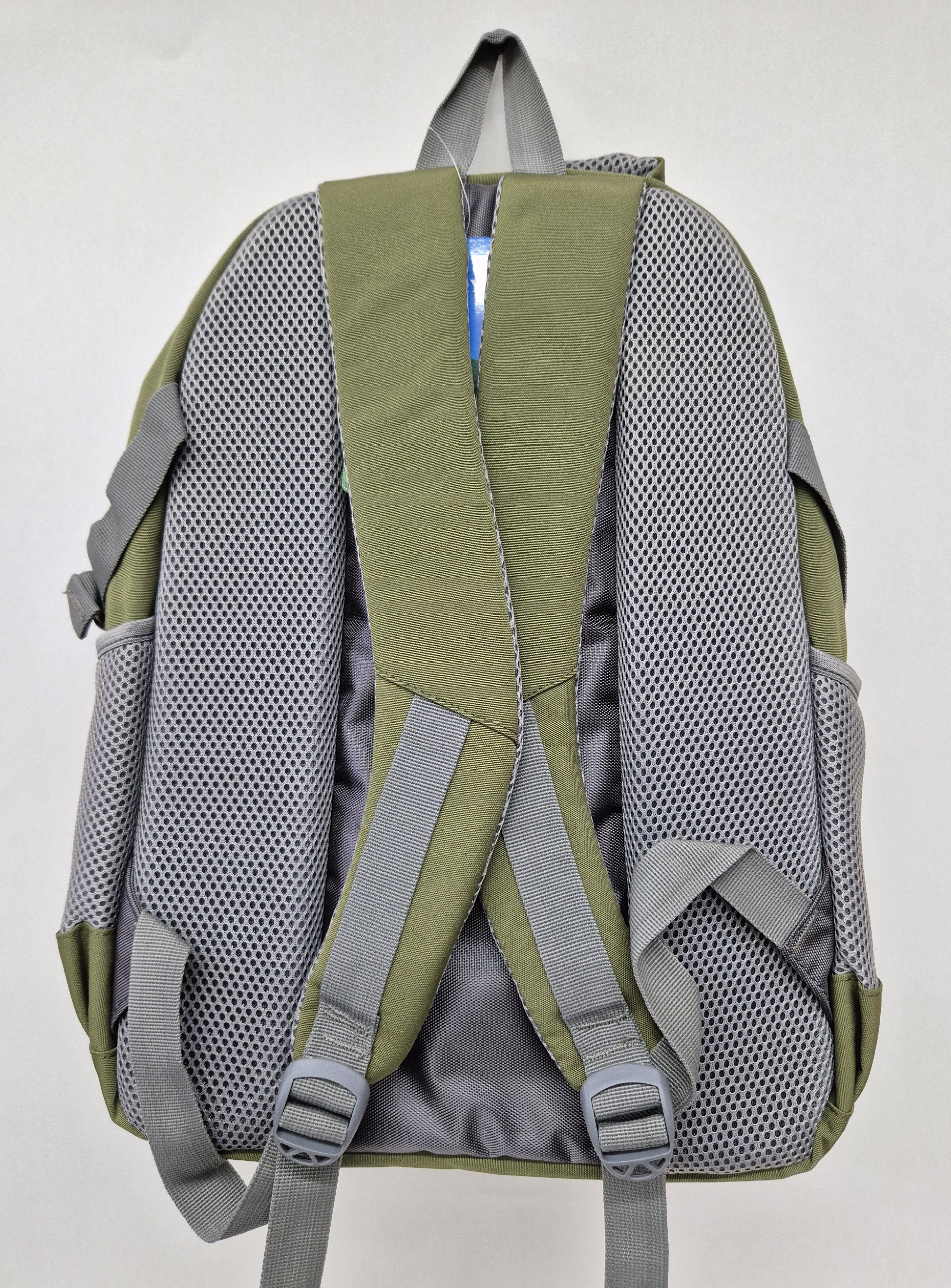 Praktický zelený ruksak trojkomorový na zipsové zapínanie. Má prednú priehradku na zips a dve bočné vrecká na fľašu. Vo vnútri hlavnej komory je priehradka na notebook a jedna malá priehradka na zips. Polstrovaná chrbtová časť aj ramenné popruhy s plastovými sponami.