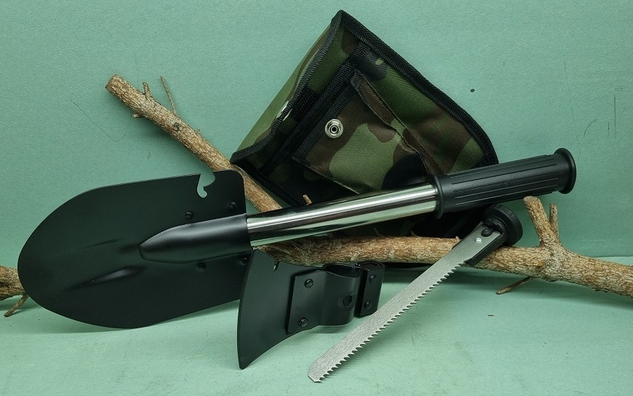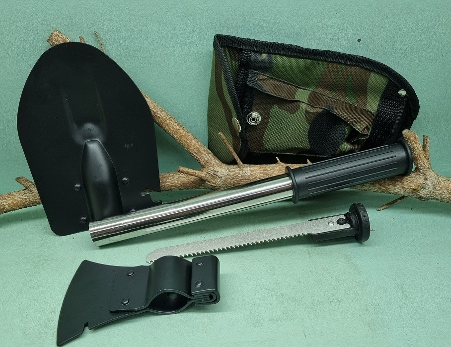 Multifunkčný skladací rýľ obsahuje : rýľ, sekeru, pílku. Maximálna dĺžka je 50cm, minimálna dĺžka 34 cm. Dodáva sa v zelenom textilnom puzdre s pútkom na opasok. Je to skvelý pomocník v domácnosti, nesmie chýbať ako súčasť výbavy auta v prípade núdze, hodí sa do prírody má všestranné použitie .