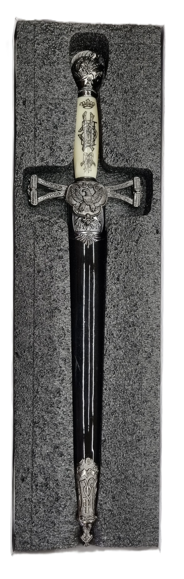 Rukoväť je bohato dekorovaná ornamentmi s motívom orla, čo podčiarkuje majestátny a rytiersky charakter zbrane. Replika sa dodáva v štýlovom darčekovom balení, vďaka čomu je ideálnym darčekom pre zberateľov, milovníkov histórie alebo ako netradičná dekorácia do interiéru.