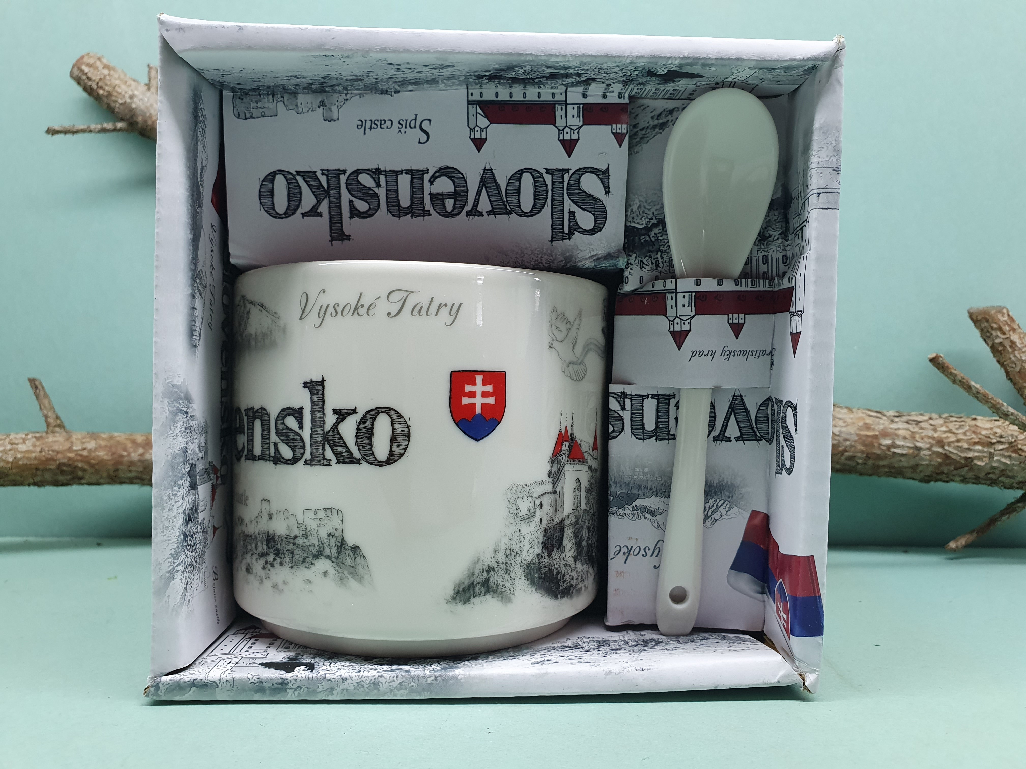 Keramická šálka s čiernym motívom Slovensko. Balenie obsahuje aj keramickú lyžičku. Obsah hrnčeka je cca 400ml.Tento produkt je skvelým darčekom pre každého, kto má rád Slovensko, jeho kultúru a pamiatky. Je vhodný na rôzne príležitosti, alebo pre hostí a návštevy zo zahraničia.