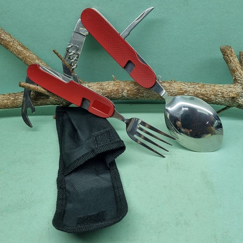 Turistický červený príbor je vhodný na cestách, turistike, kempovaní aj rybačke. Obsahuje vidličku, lyžicu, nôž, otvárač na víno a otvárač na konzervy.
