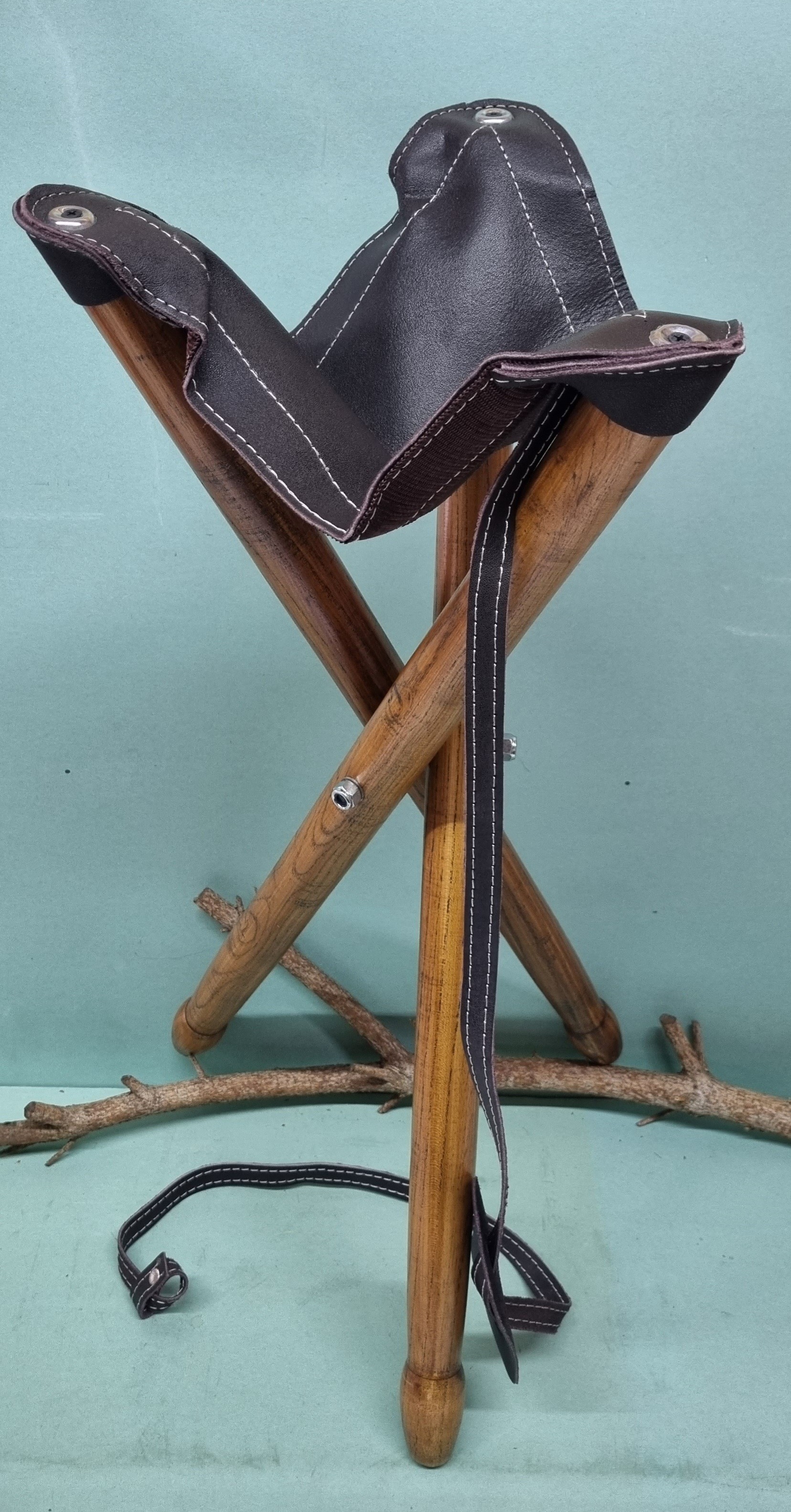 Trojnohá stolička s pevným koženým sedadlom a drevenými nohami. Obsahuje aj kožený popruh ktorý sa zachytí o nohy stoličky a tak sa dá prevesiť cez rameno.
