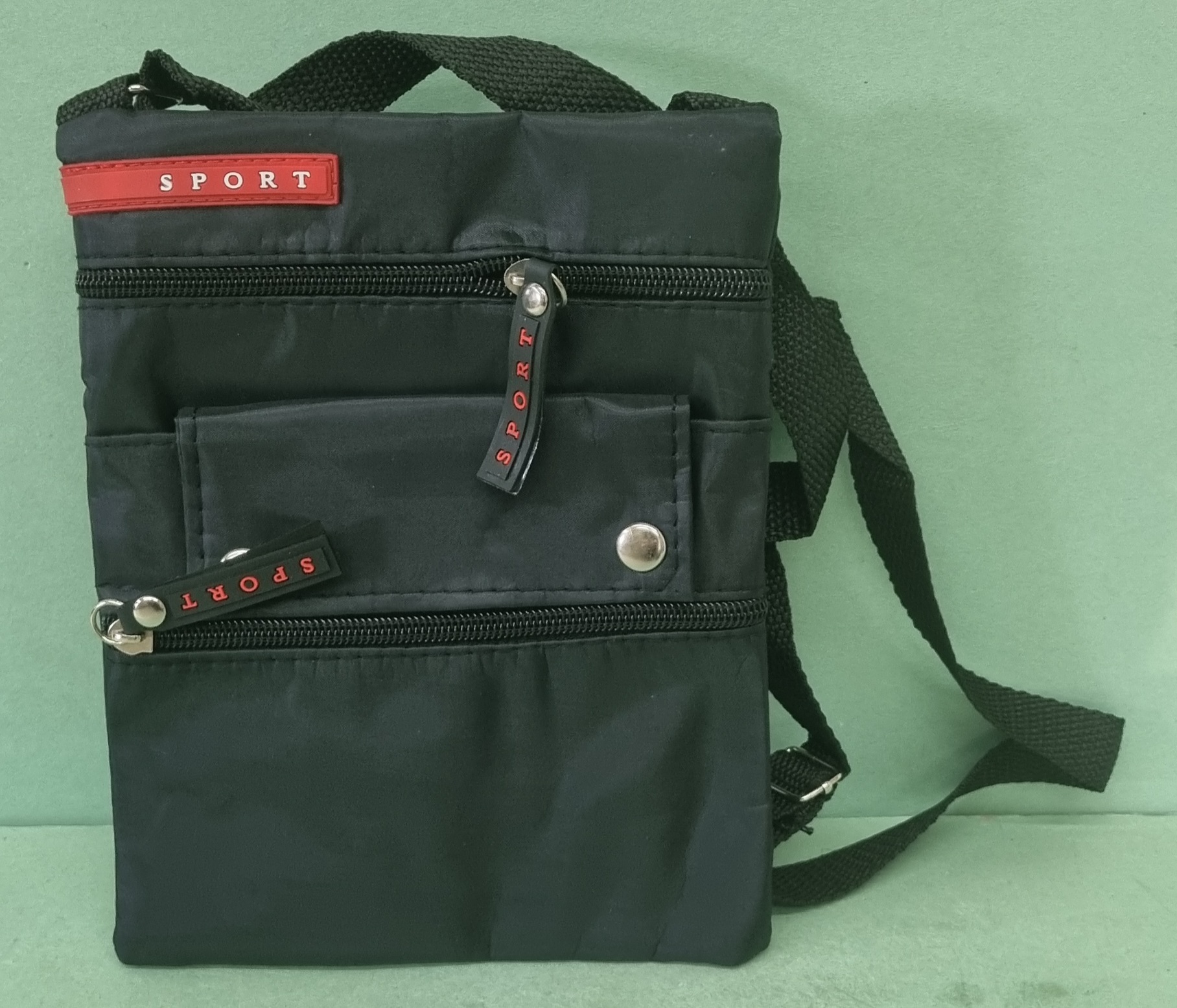 Praktická malá taška cez plece má jednu zadnú a dve predné priehradky uzatvárané na zips. Jedna predná priehradka sa uzatvára na patent. Popruh je nastaviteľný široký 2,5cm. Rozmer tašky je 20x17cm