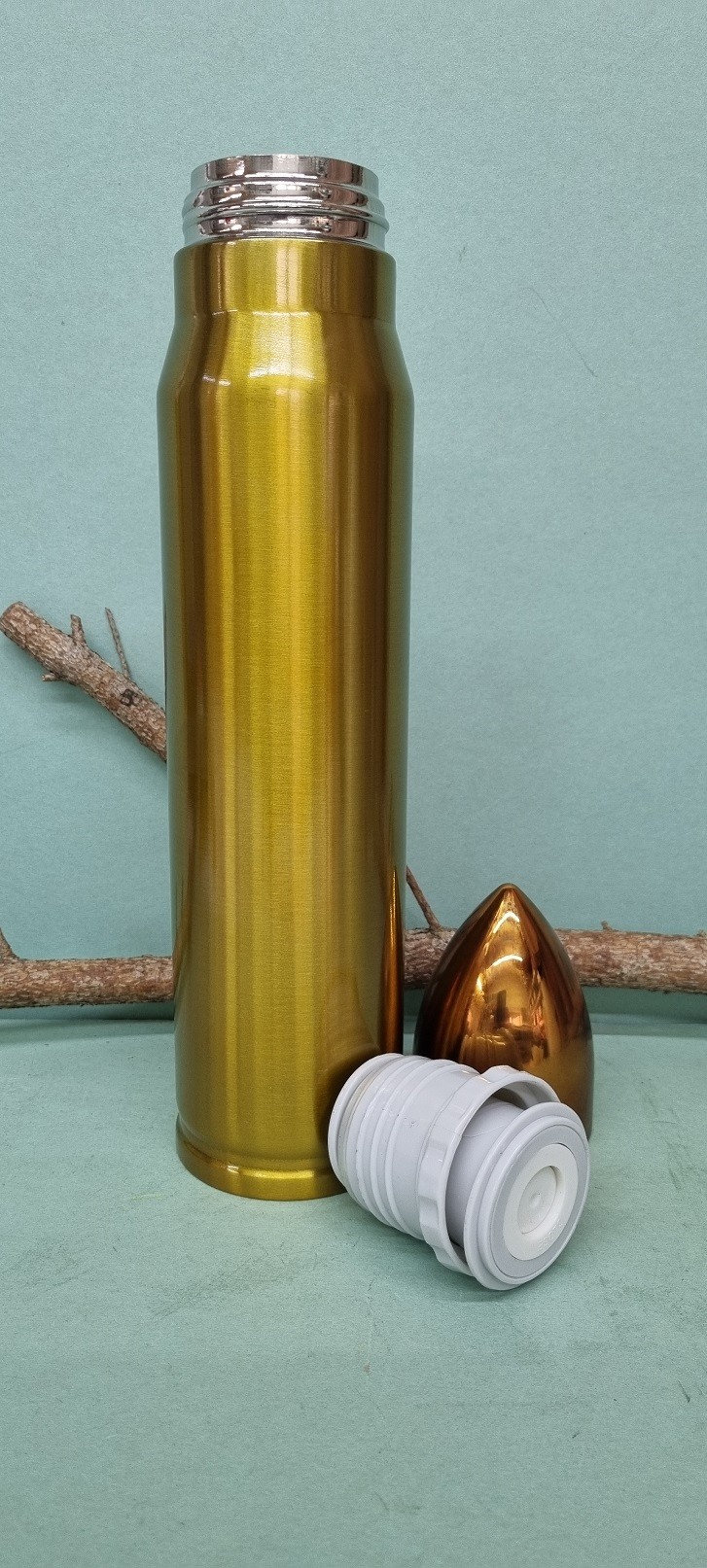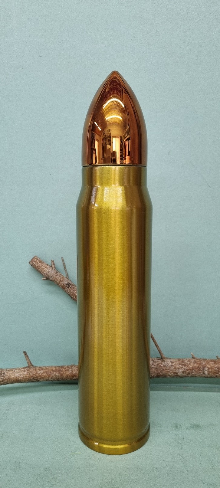 Nerezová termoska v tvare náboja s objemom 1000ml. Vrchnák slúži ako pohár, poistný uzáver ako dávkovač. Výška termosky je 37cm.