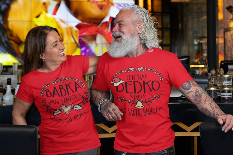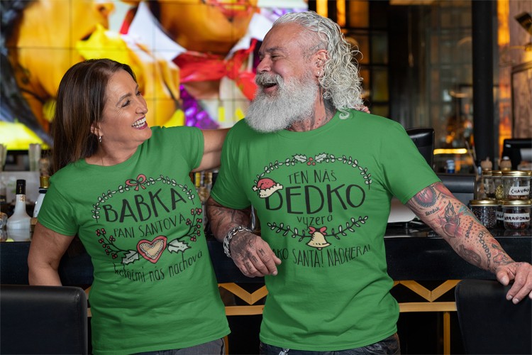 Kvalitné tričká s krátkym rukávom s nápisom Babka pani Santová koláčmi nás nachová, pánske tričko s nápisom Ten náš dedko vyzerá ako Santa nádhera. Sú vyrobené zo 100% bavlny, majú pohodlný strih a ľahkú váhu 160g/m2 čo zabezpečuje príjemné nosenie v akomkoľvek počasí, tričká sú vhodné na každodenné použitie.