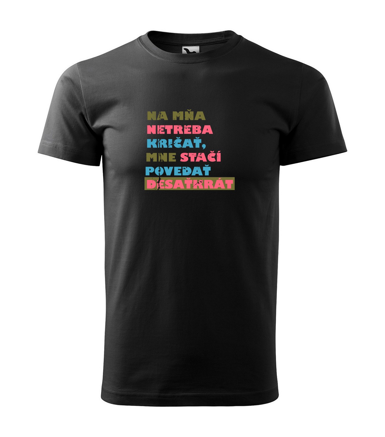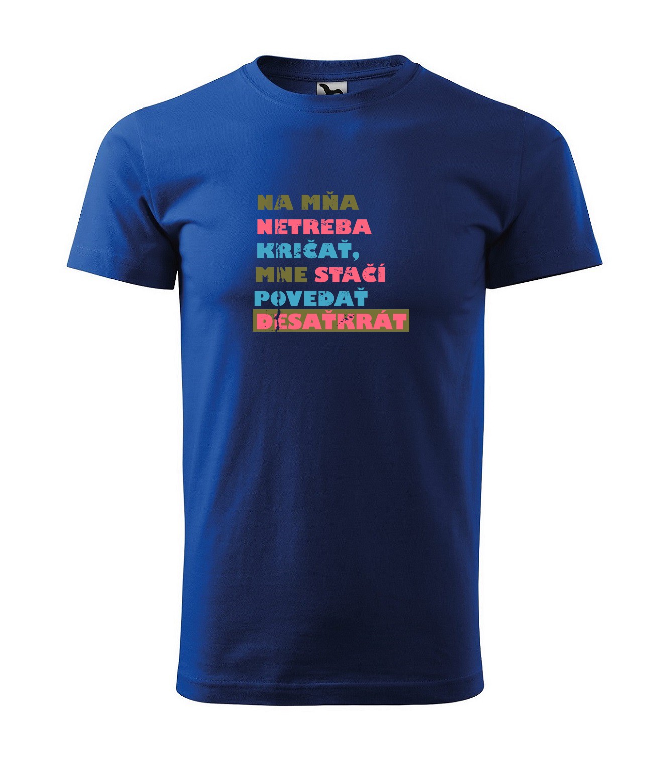 Kvalitné tričko s krátkym rukávom s nápisom : Na mňa netreba kričať, mne stačí povedať desaťkrát. Je vyrobené zo 100% bavlny má pohodlný strih a ľahkú váhu 160g / m2 , čo zabezpečuje prijemné nosenie v akomkoľvek počasí , tričko je vhodné na bežné použitie .