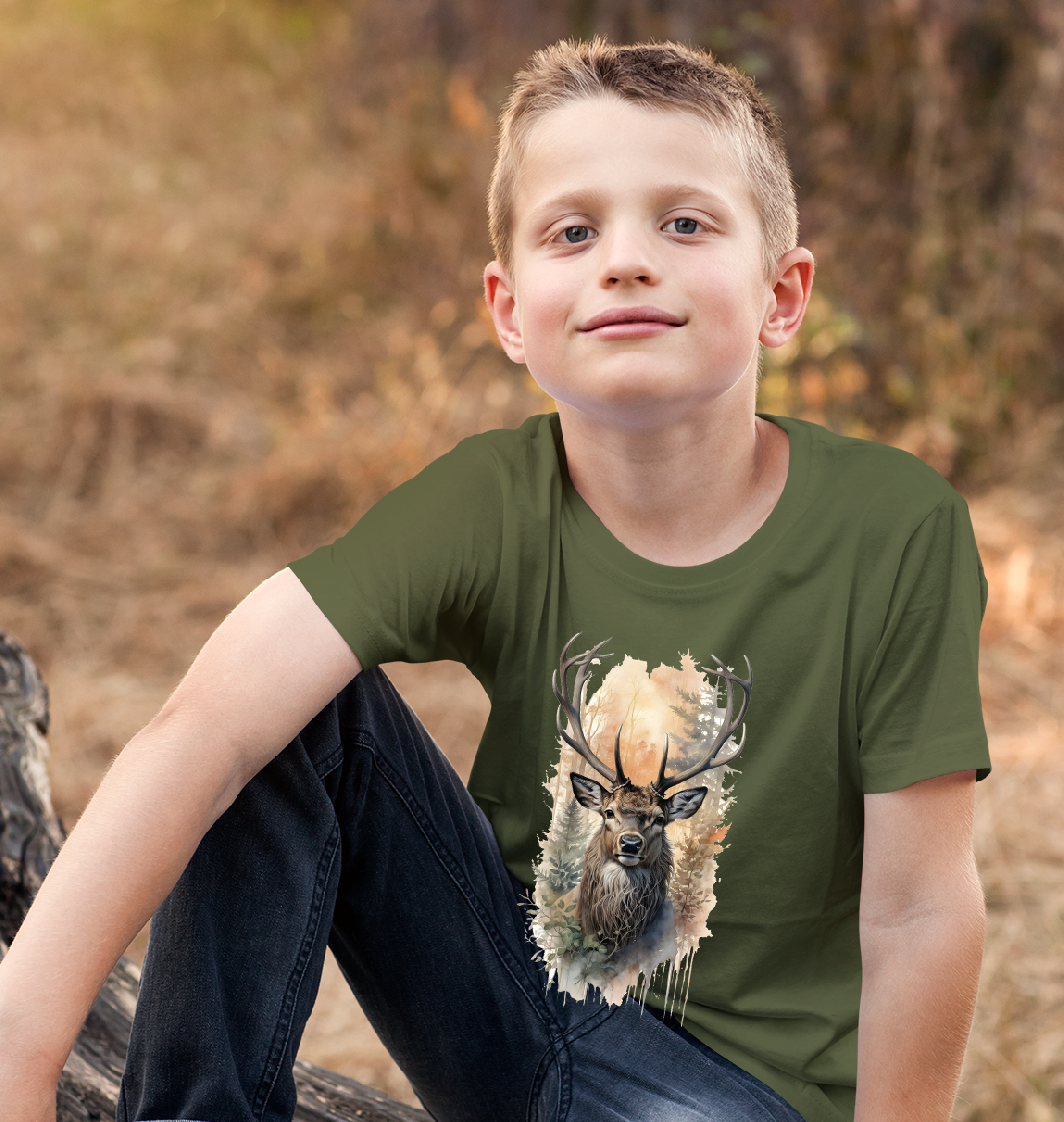 Detské tričko s krátkym rukávom, poľovníckym motívom Jeleň Fj6 pre malých dobrodruhov, ktorí majú radi zvieratka a prírodu. Tričko vyrobené zo 100% bavlny s hmotnosťou 160g je  ľahké, priedušné a pohodlné na nosenie pre aktívne deti.