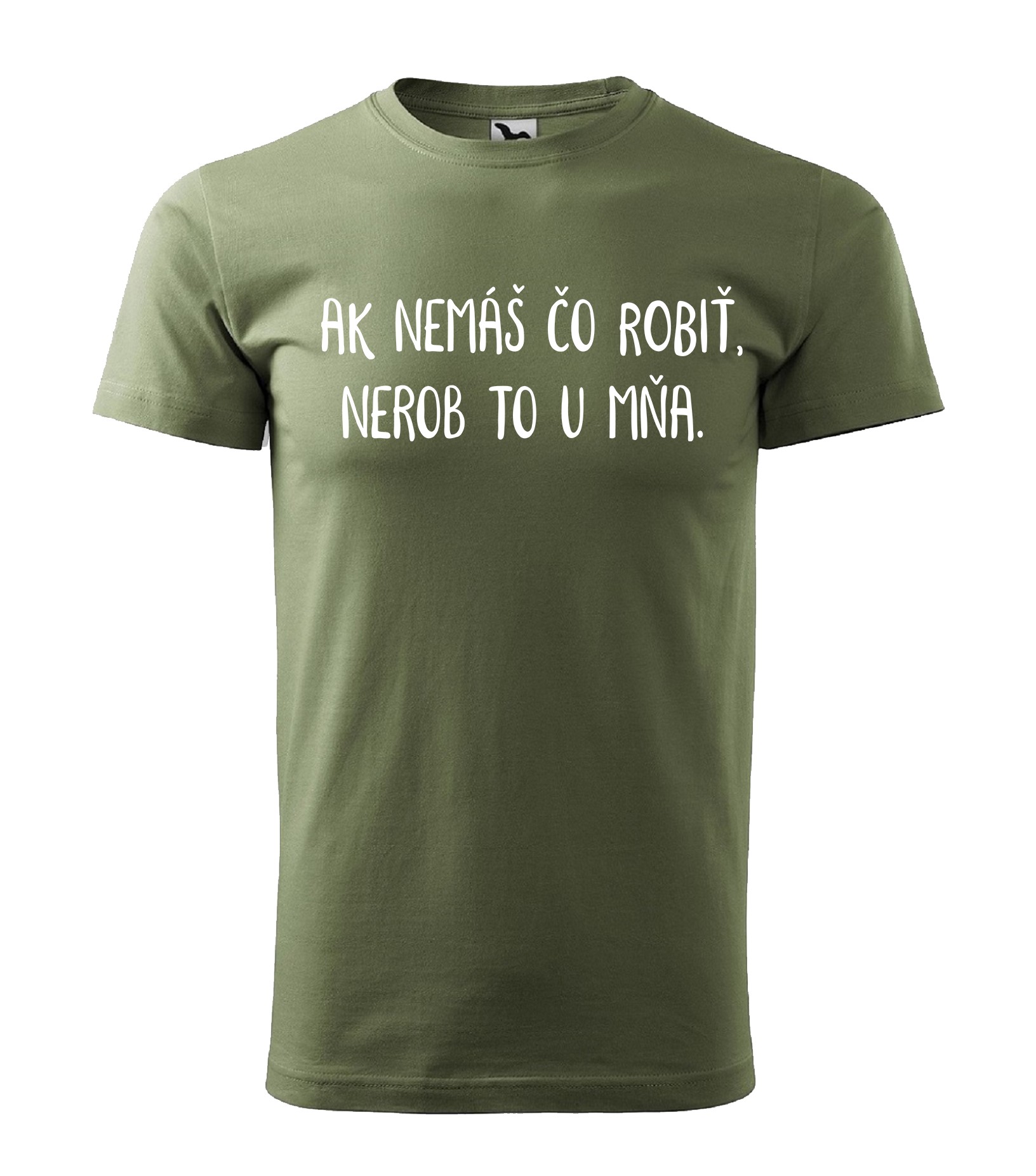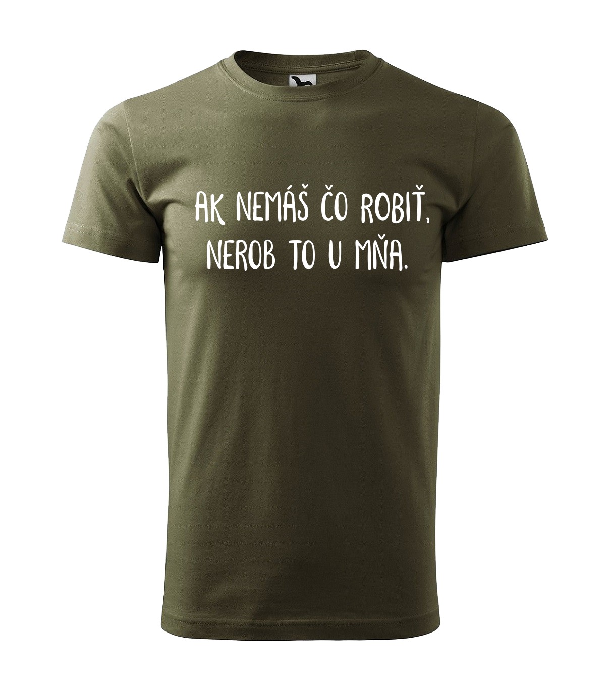 Kvalitné tričko s krátkym rukávom s nápisom: Ak nemáš čo robiť, nerob to u mňa. Je vyrobené zo 100% bavlny má pohodlný strih a ľahkú váhu 160g / m2 , čo zabezpečuje prijemné nosenie v akomkoľvek počasí, tričko je vhodné na bežné použitie.