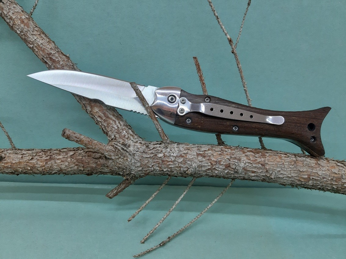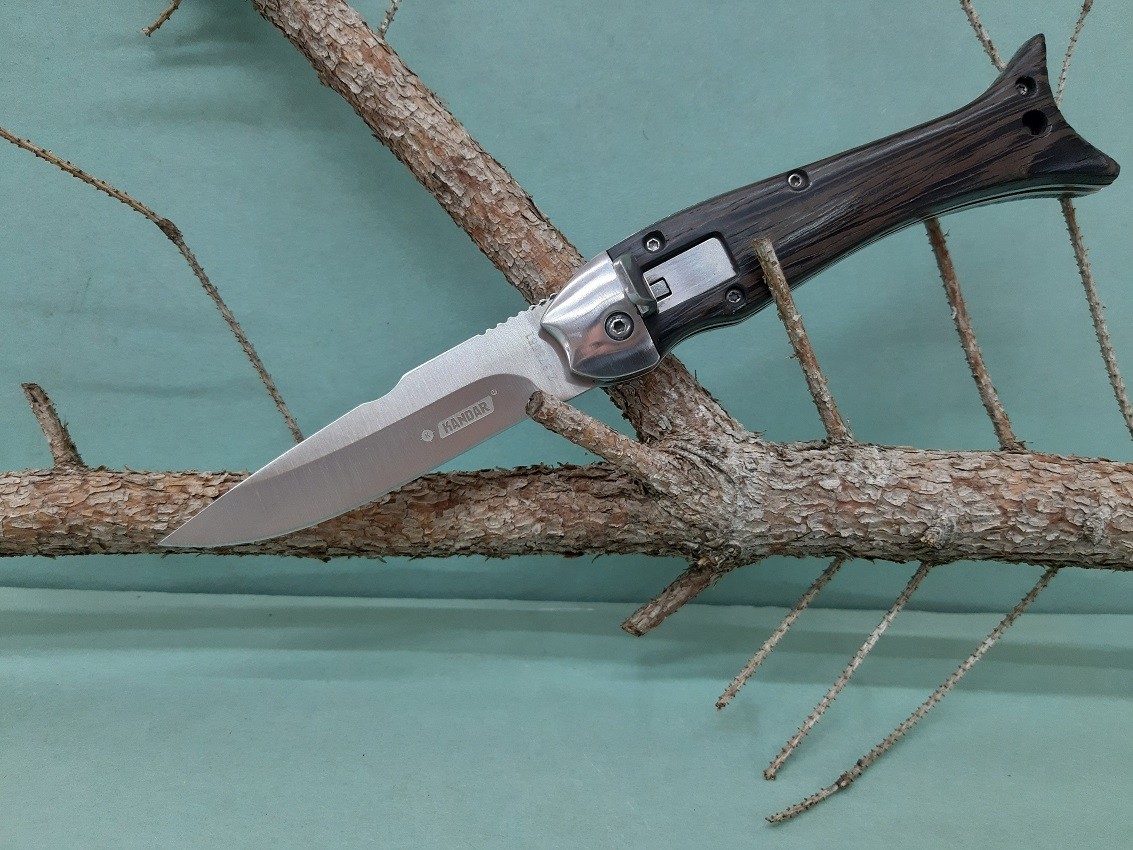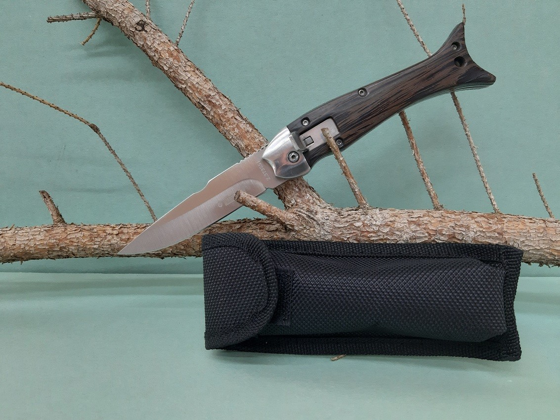 Vreckový zatvárací nôž nerezová vyskakovačka s čiernym nylónovým púzdrom a drevenou rukoväťou. Dĺžka čepele je 9 cm a celková dĺžka noža je 21 cm. Na zadnej strane sa nachádza klip na uchytenie na opasok.