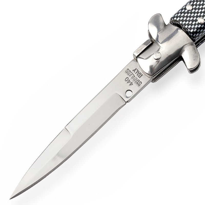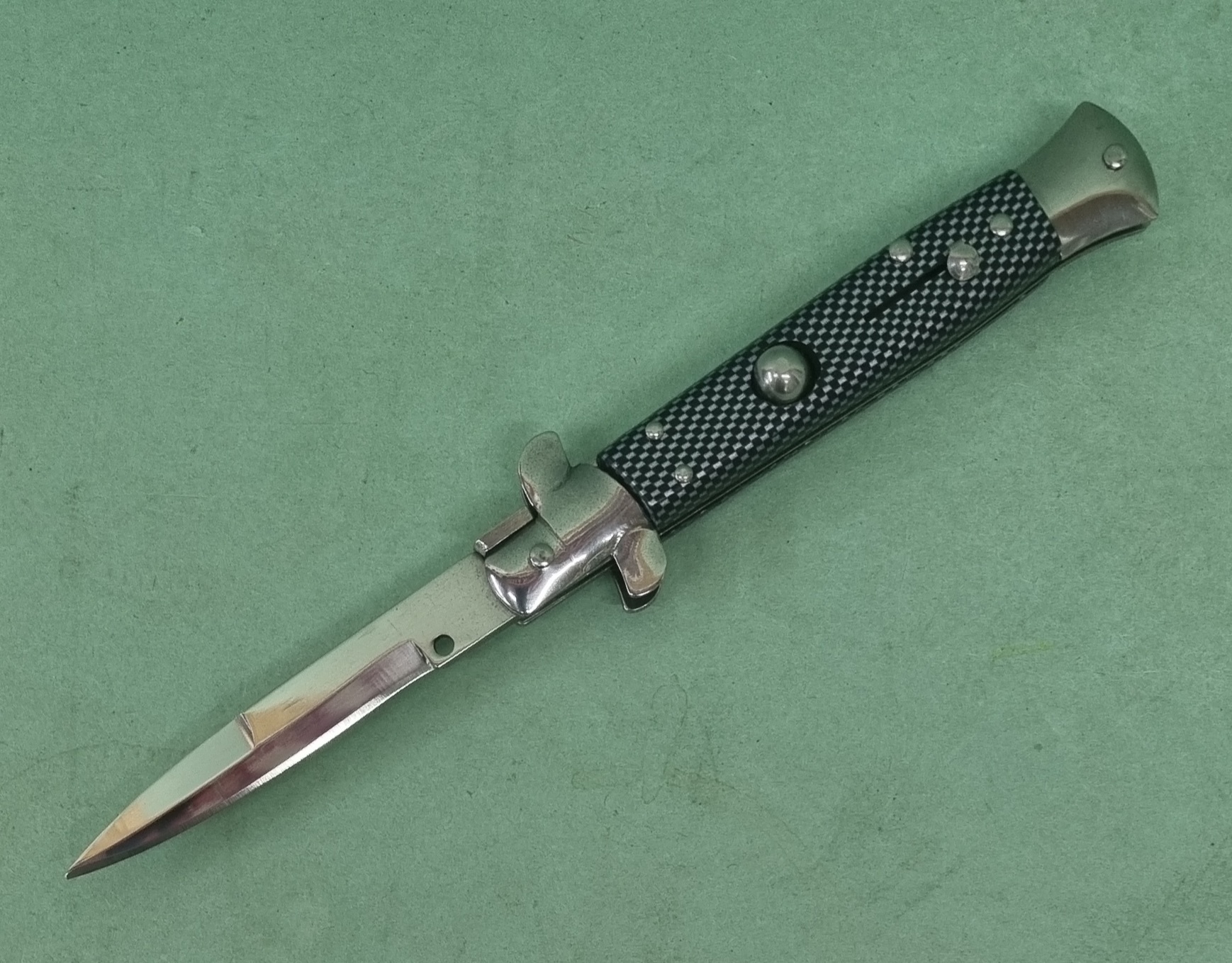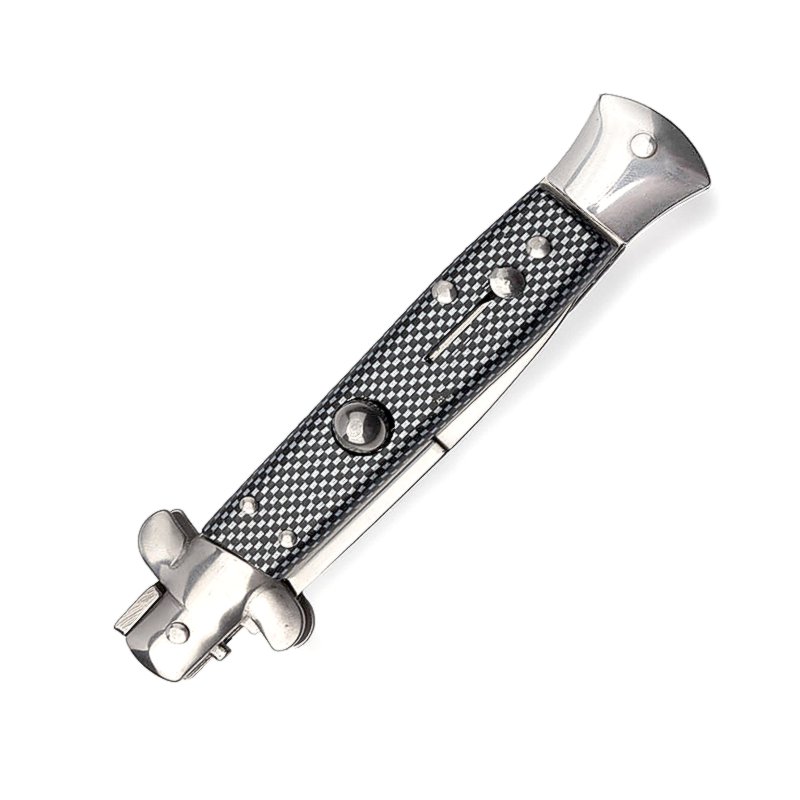 Vreckový vyskakovací nôž s nerezovou čepeľou, kombinovanou rukoväťou s kovom. Tlačidlo na otvorenie noža pracuje na princípe pružiny ktorá po odistení otvorí čepeľ noža z boku stačí vám na to jedna ruka. Dĺžka noža je 21 cm čepeľ noža je dlhá 9 cm.