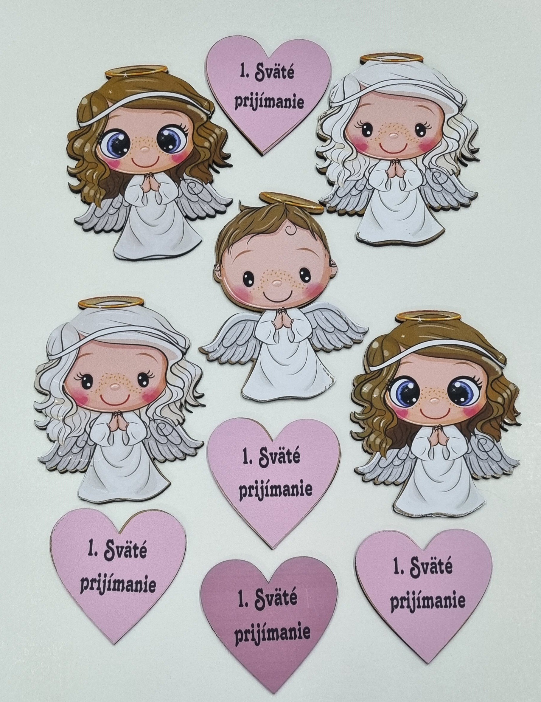 Set drevených zápichov na tortu určený na krst alebo 1. sväté prijímanie s motívom anjelika na jednom zápichu a na druhom s menom dieťaťa, srdiečkom a dátumom narodenia a krstu,alebo s dátumom 1. svätého prijímania. Meno a dátumy stačí, keď uvediete do poznámky.