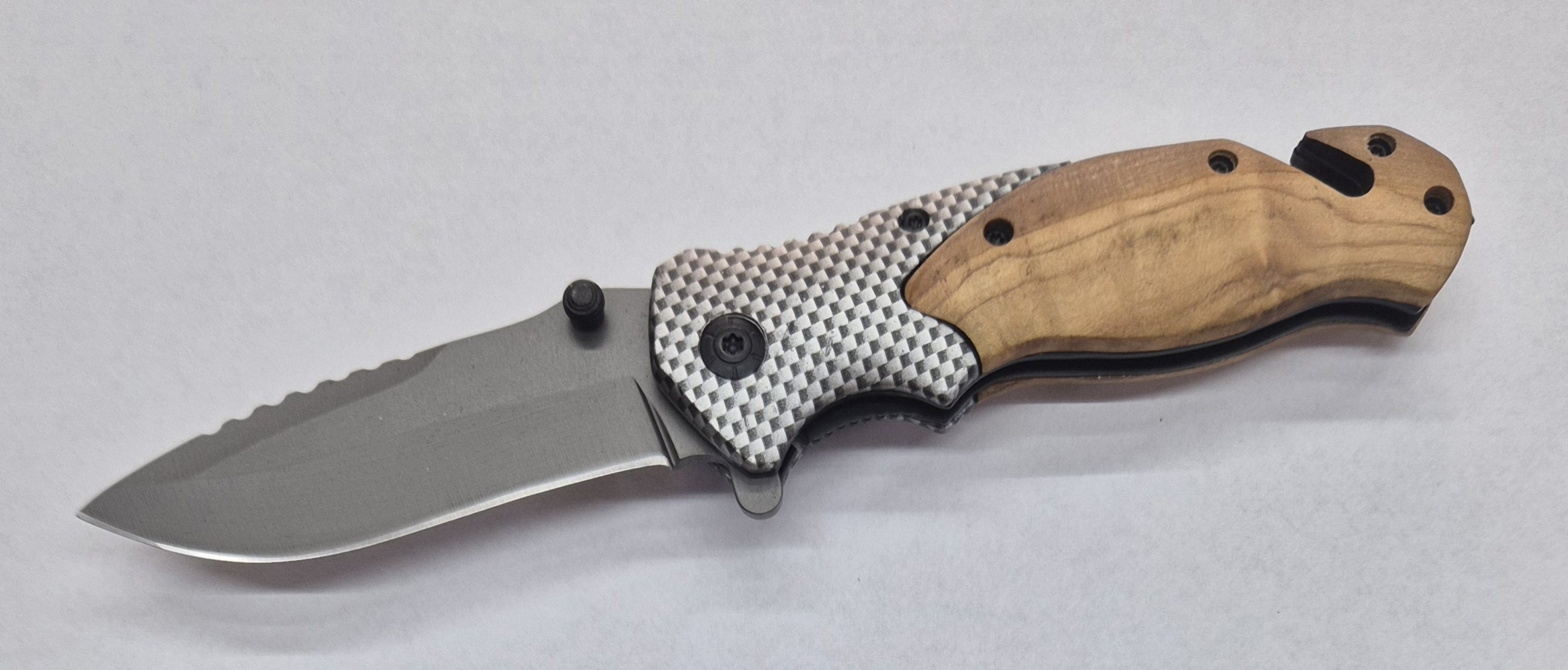 Zatvárací nôž s nerezovou 8,5cm čepeľou, kombinovanou rukoväťou drevo/kov, rezačom na lano, hrotom na rozbíjanie skla, poistkou a asistenciou na otváranie jednou rukou. Na zadnej strane sa nachádza klip na zavesenie na opasok. Dĺžka noža je 20,5cm.