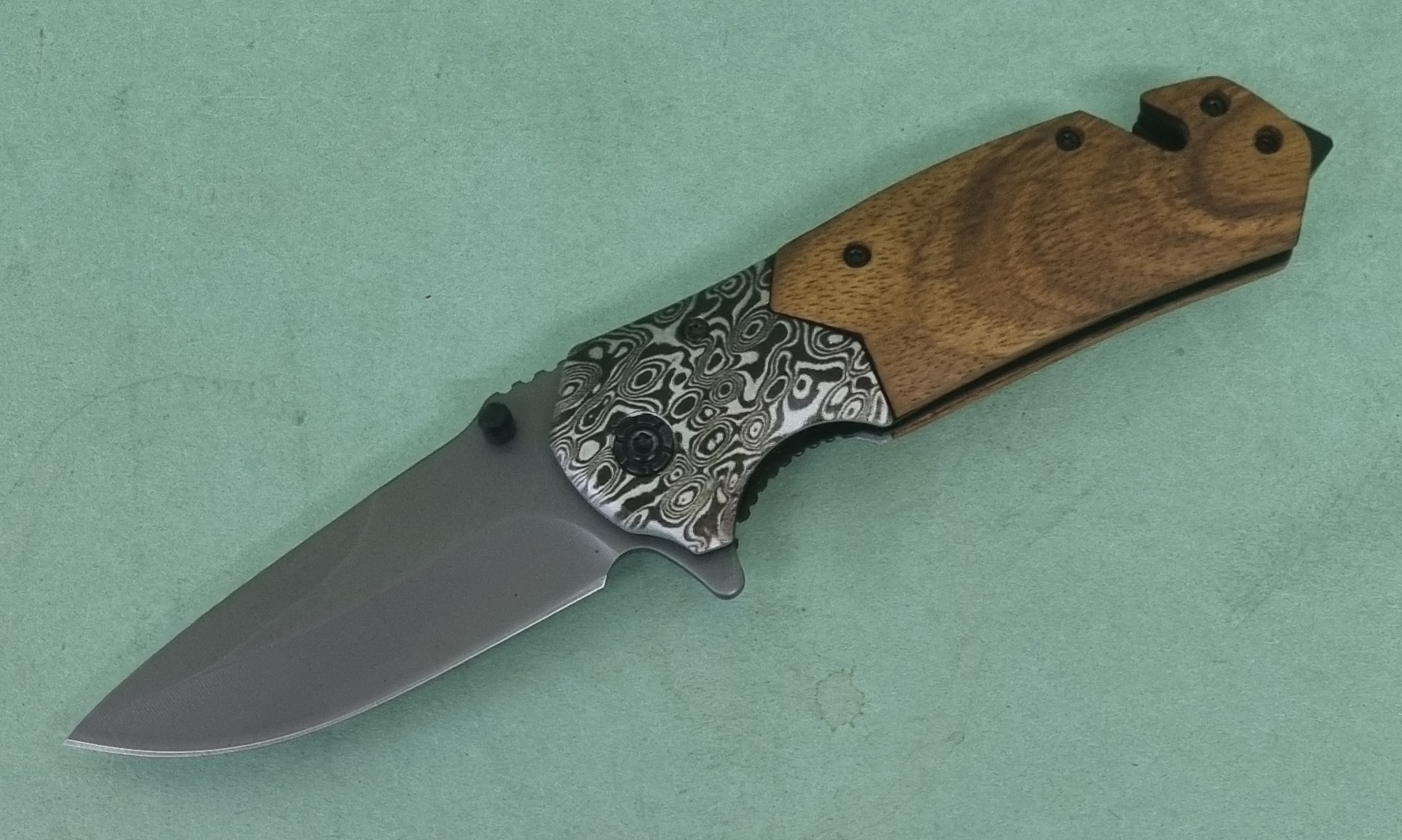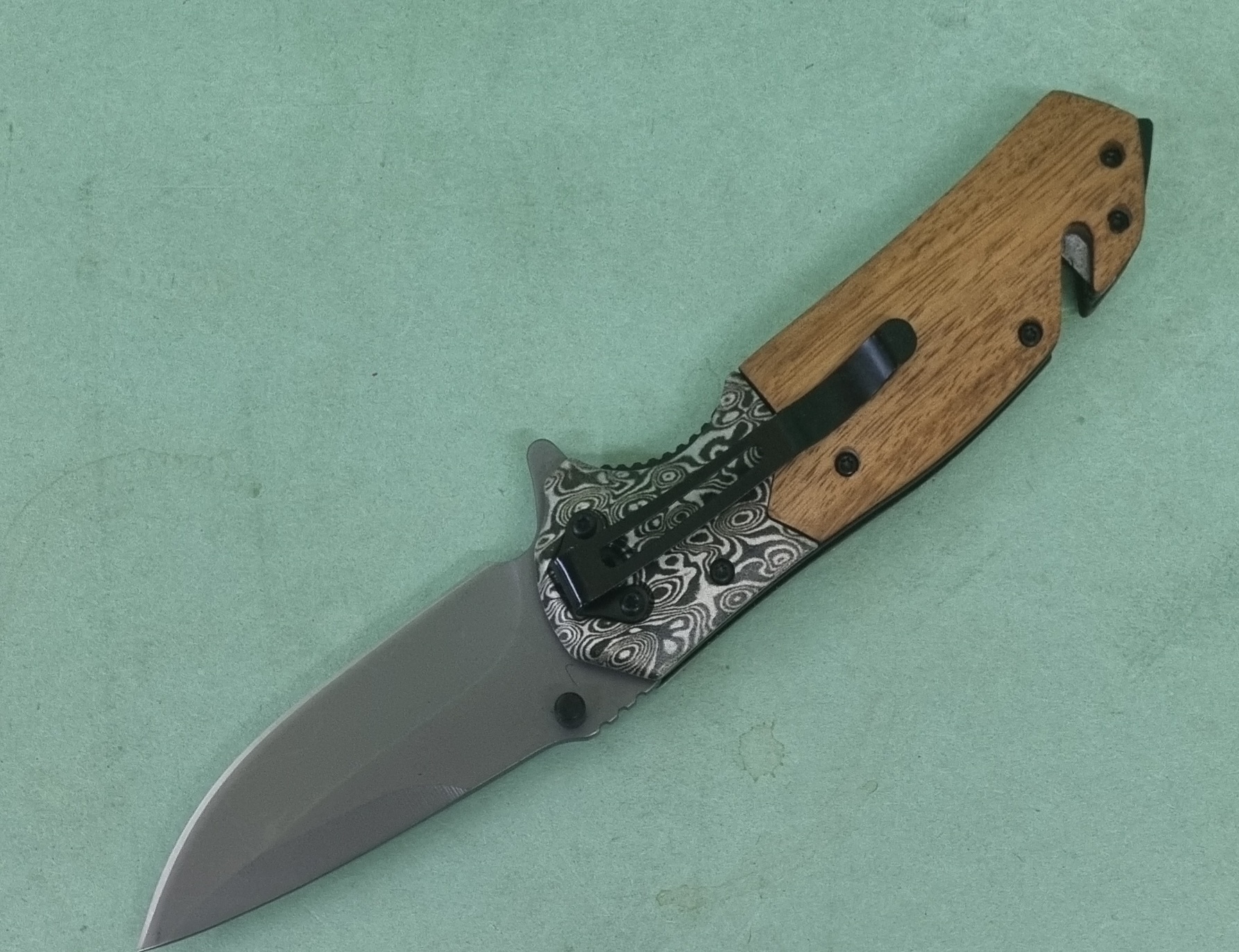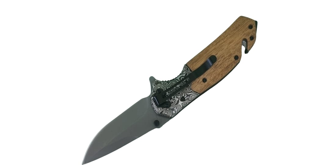 Zatvárací vreckový nôž s 8,5cm nerezovou čepeľou, kombinovanou gravírovanou rukoväťou kov/drevo. Taktiež má rezač na lano, hrot na rozbíjanie skla, poistku proti samovoľnému zatvoreniu, asistenciu na otváranie jednou rukou a klip na zavesenie na opasok. Celková dĺžka noža je 21cm.