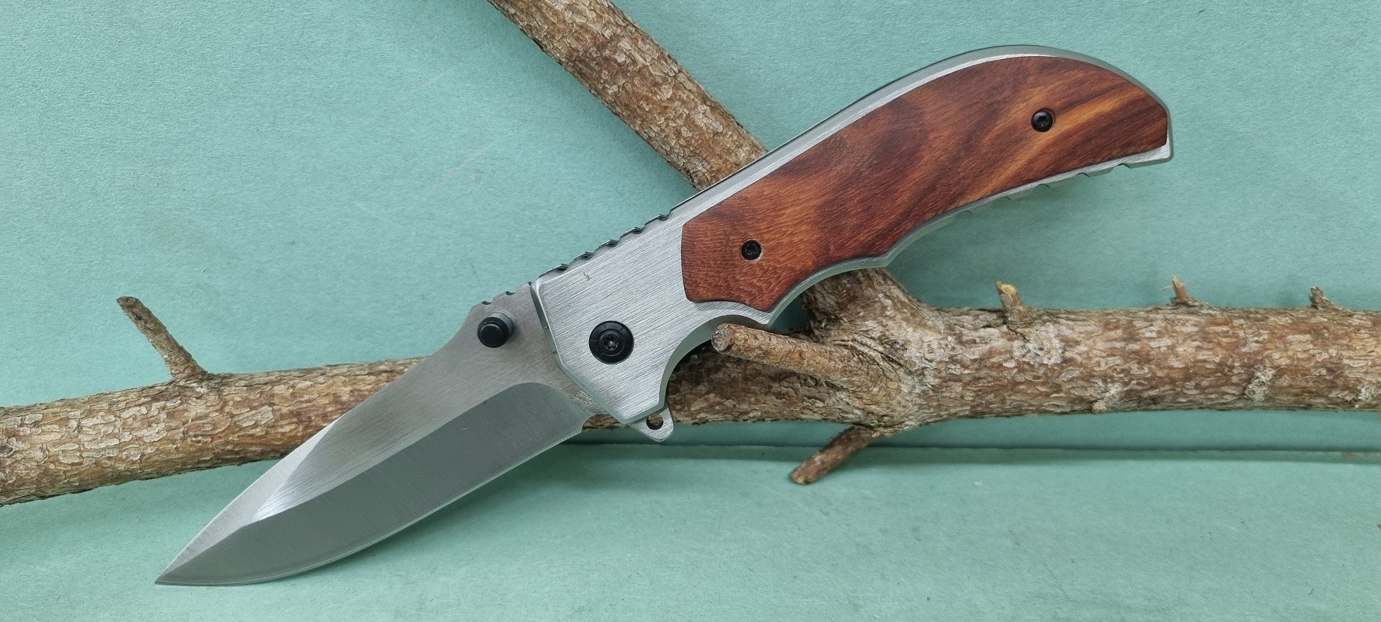 Vreckový zatvárací nôž s 9,5cm nerezovou čepeľou. Kombinovanou rukoväťou drevo/kov, s poistkou a s asistenciou na otváranie jednou rukou. Na zadnej časti má klip na uchytenie na opasok. Celková dĺžka noža je 21,5cm.