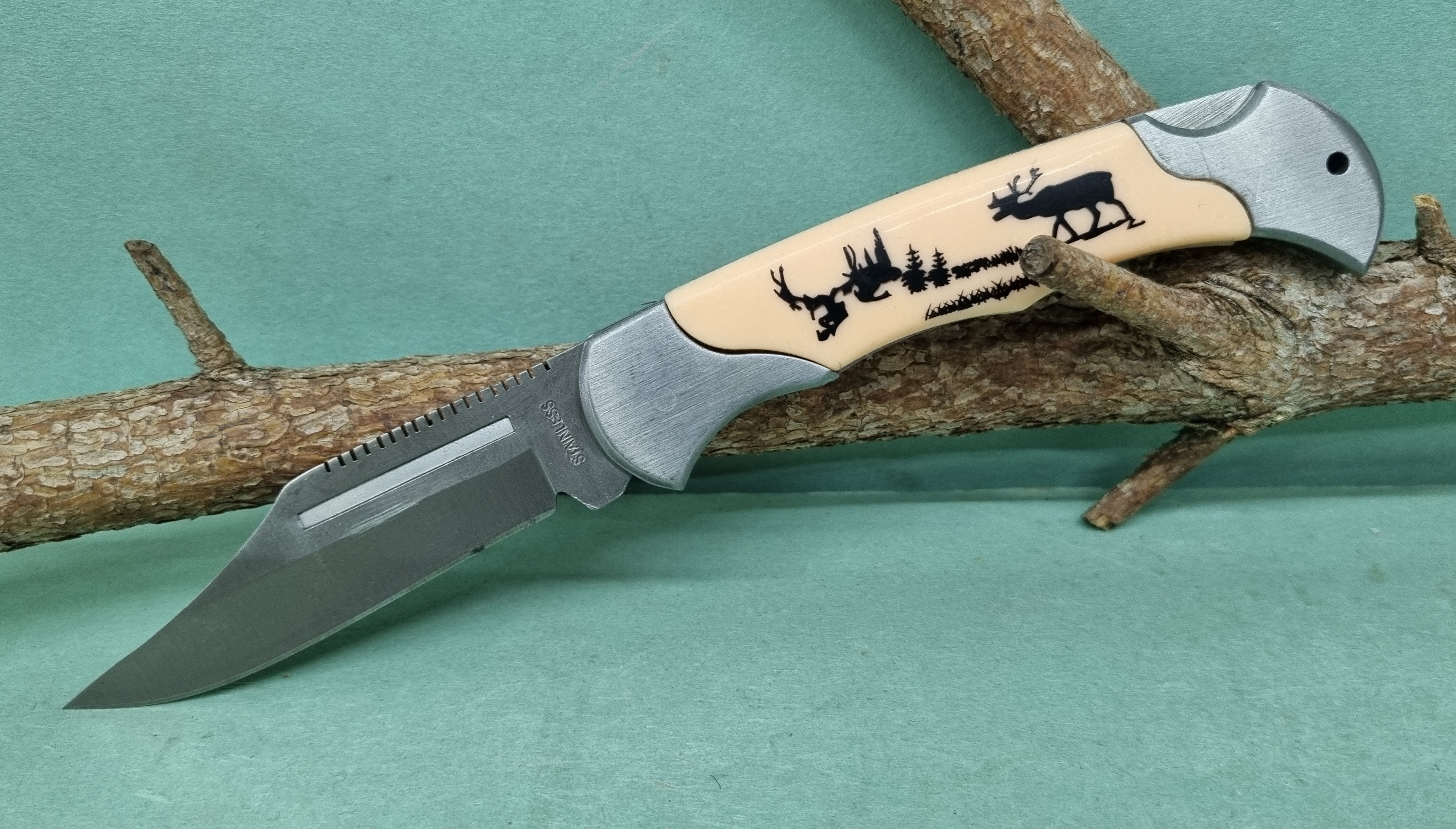 Zatvárací vreckový nôž s nerezovou 8cm čepeľou so zúbkami na hornej časti čepele. Kombinovanou rukoväťou kov/imitácia kosti a motívom jeleň v prírode. Na konci noža je poistka a očko na prevlečenie šnúrky. Celková dĺžka noža je 18cm.