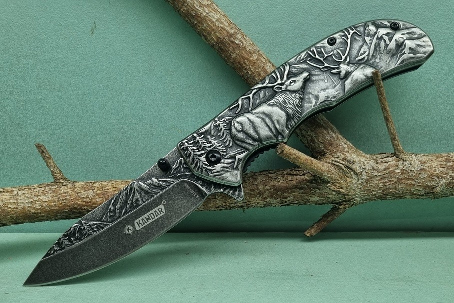 Zatvárací vreckový nôž s nerezovou 9,5cm gravírovanou rukoväťou s motívom hory, kovovou rukoväťou s motívom jeleň, poistkou a s asistenciou na otváranie jednou rukou. Na zadnej časti má klip na uchytenie na opasok. Celková dĺžka noža je 21,5cm.