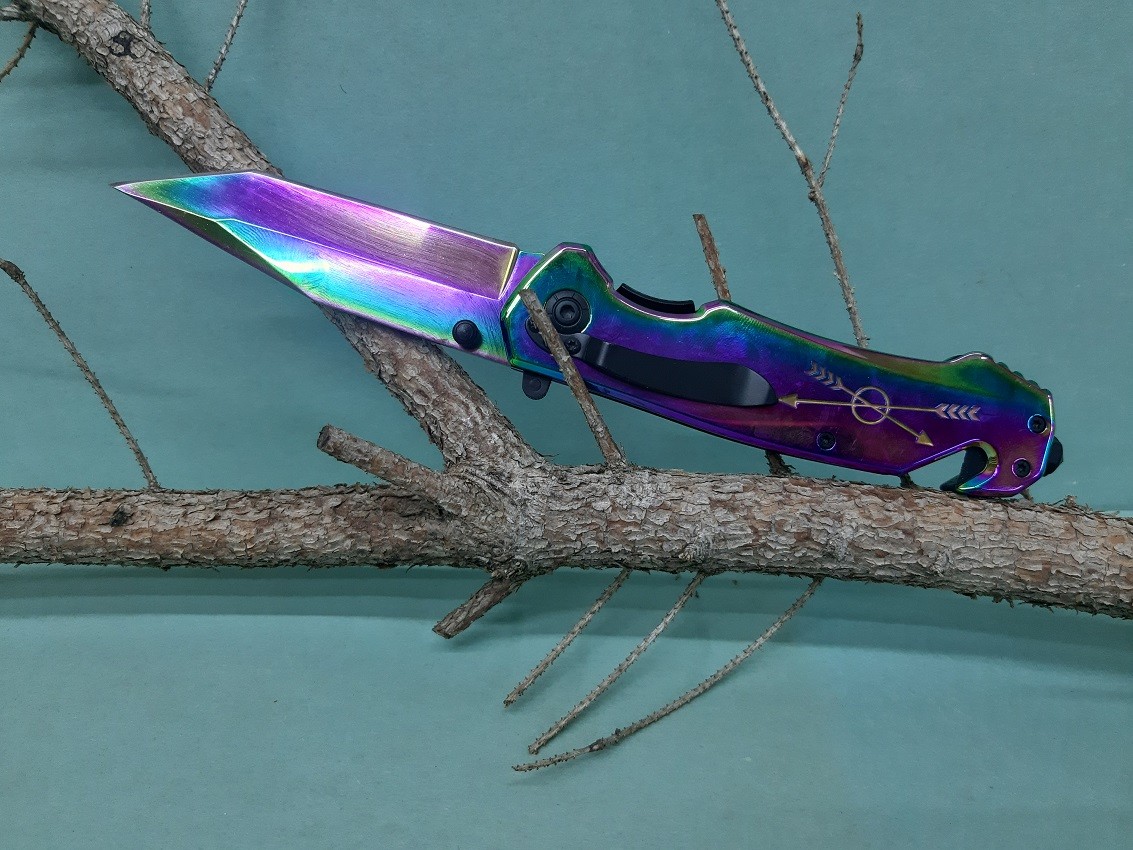 Zatvárací vreckový nôž s 9,5cm dúhovou nerezovou čepeľou. Kovovou, dúhovou rukoväťou s motívom lebka, poistkou proti samovoľnému zatvoreniu noža a klipom na zavesenie na opasok. Nôž má asistenciu na otváranie jednou rukou. Celková dĺžka noža je 23cm.